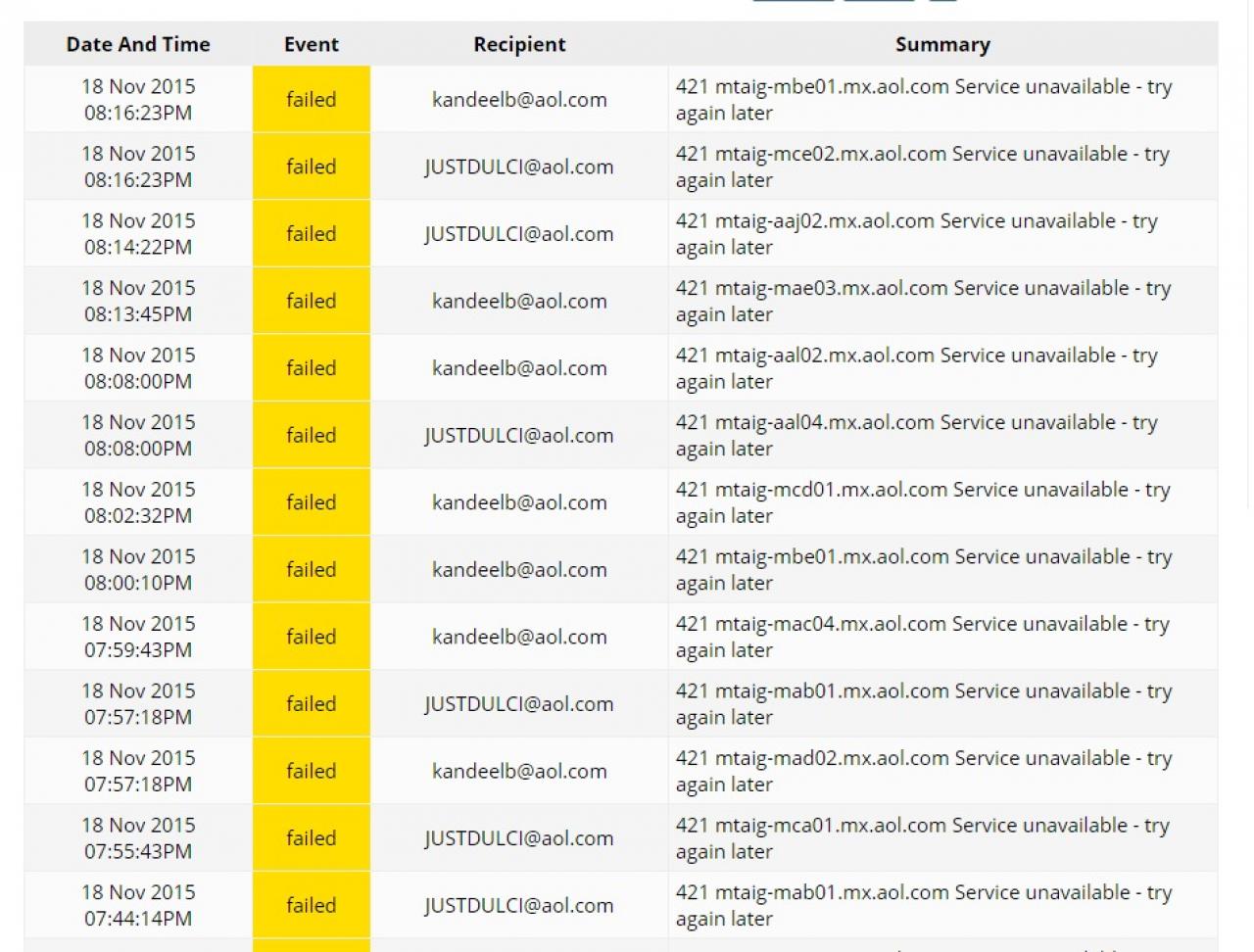 In the past few days, these two members' AOL addresses have been creating more and more notification fails in my email activity log- see screenshot.