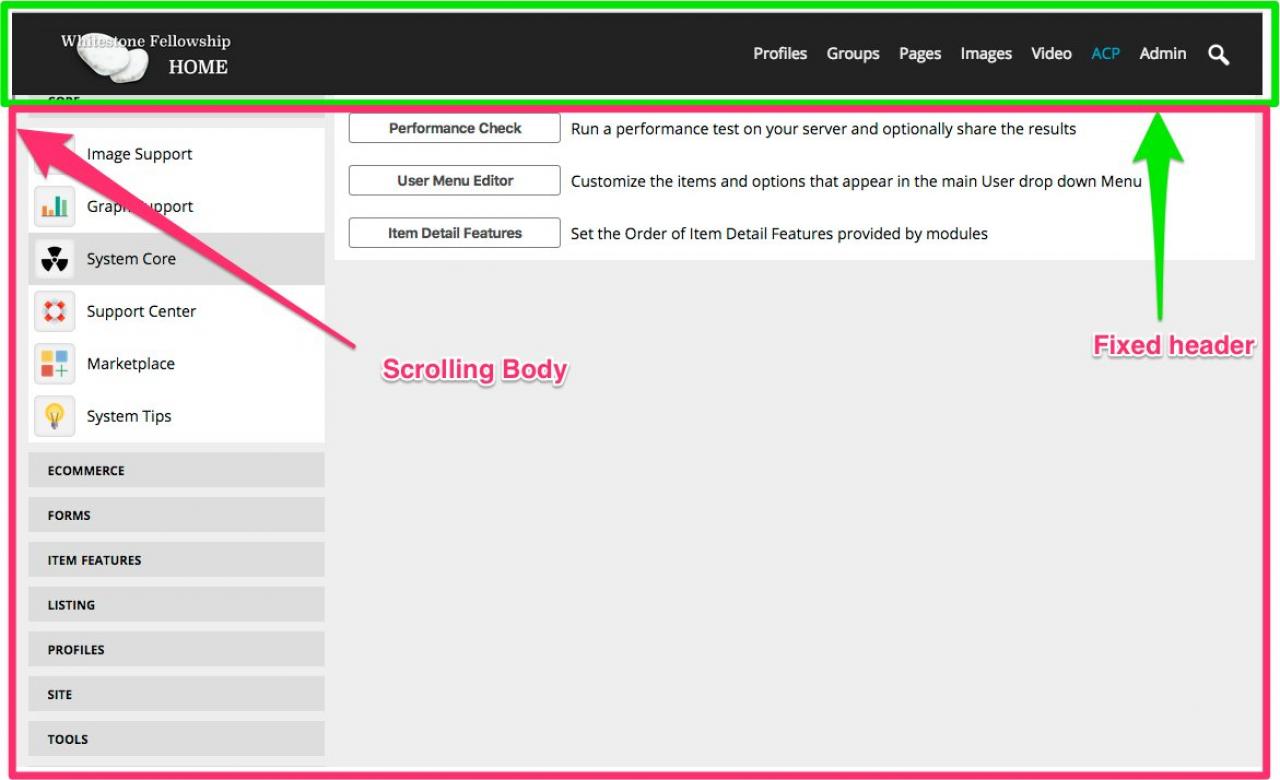 This skin has a fixed header and a scrolling body so if the page is long and you scroll down, the top part should slide under the 'Fixed header' section at the top. (screenshots)