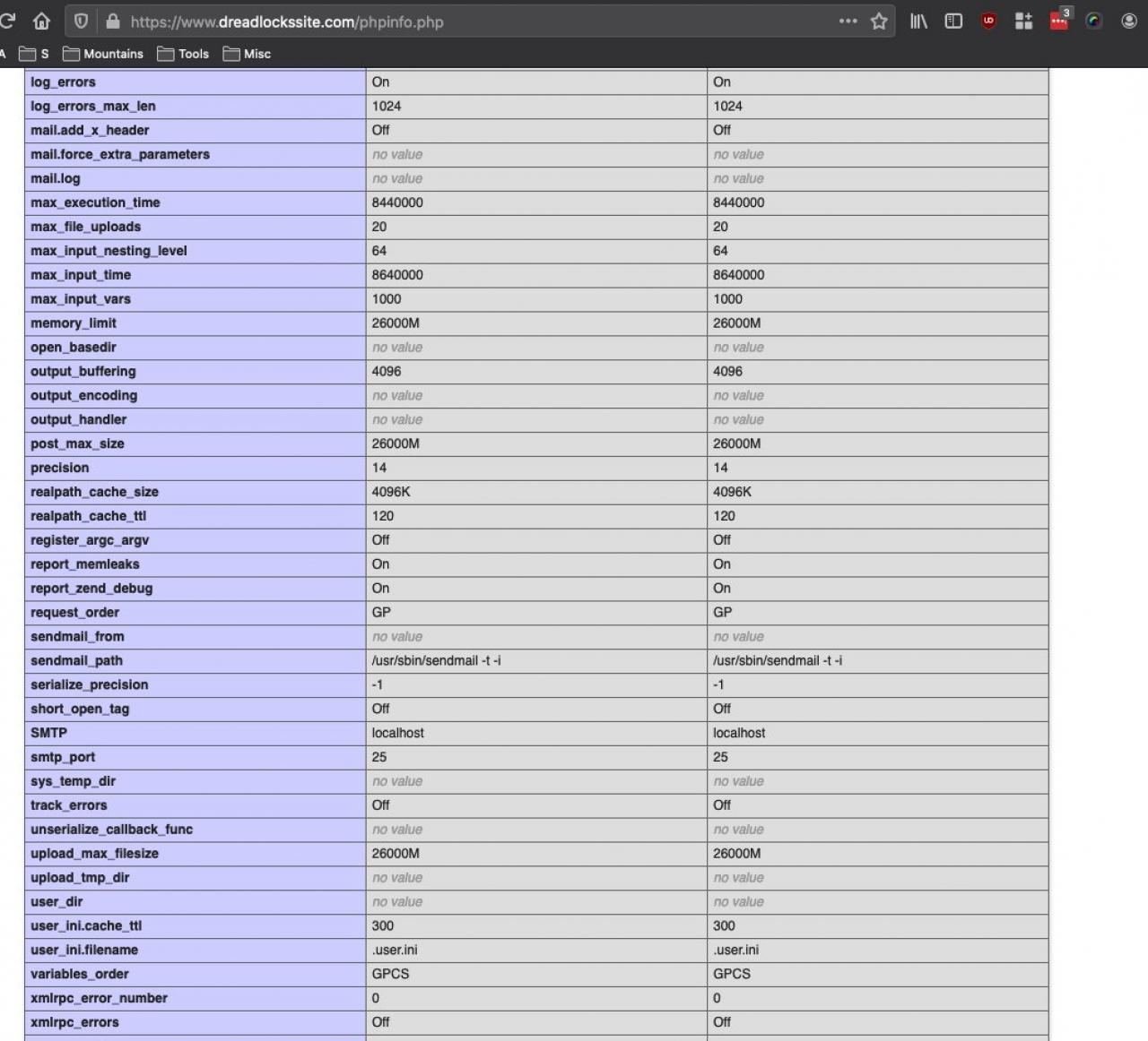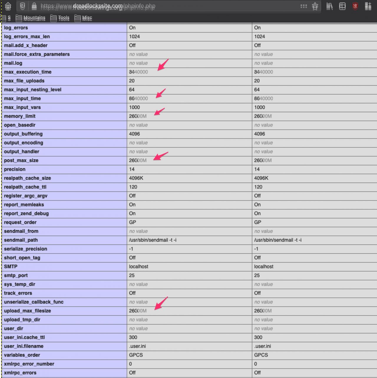 phpinfo seems to be the same (26g memory limit max post and upload limit)