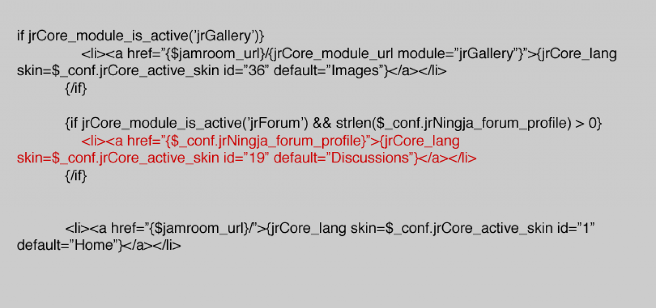 <li><a href="{$_conf.jrNingja_forum_profile}">{jrCore_lang skin=$_conf.jrCore_active_skin id="19" default="Discussions"}</a></li>