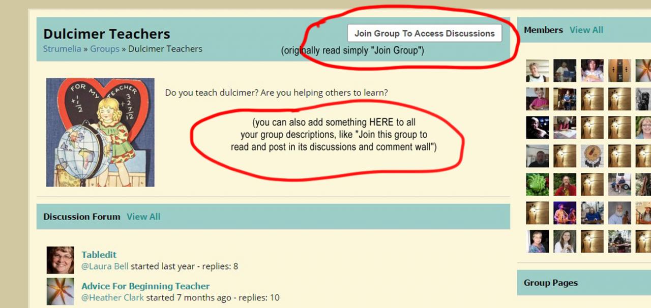 In Jamroom, we get no such message. Instead, if one clicks on a group discussion, you'll be able to read the first post, but nothing else shows. If you're not sharp (by noticing that the number of replies is listed in the list of group discussions), you'd think maybe all the discussions had no responses at all. Plus you don't see any comment wall at all if you're not a group member, and in fact wouldn't know a comment wall existed. Thus the group might seem rather dead, not worth joining.