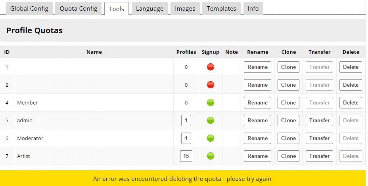 Encountered this problem while assigning quotas.. deleted the example quata , don't know if this had something to do with the error. I was using the nova skin and none of the profiles are showing on main page. Had to switch to elastic.
