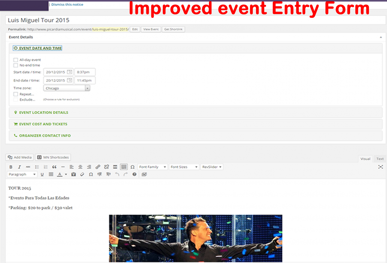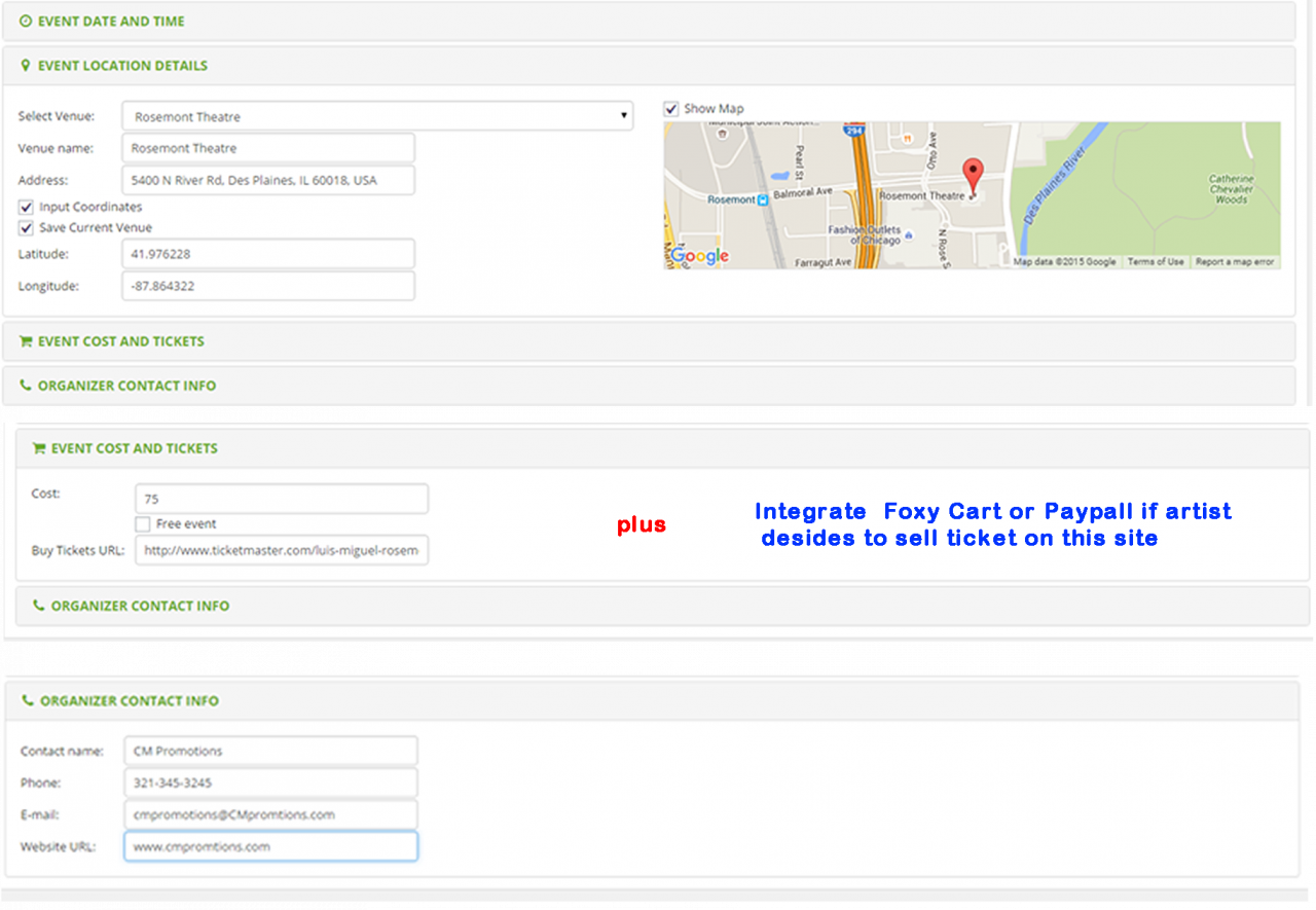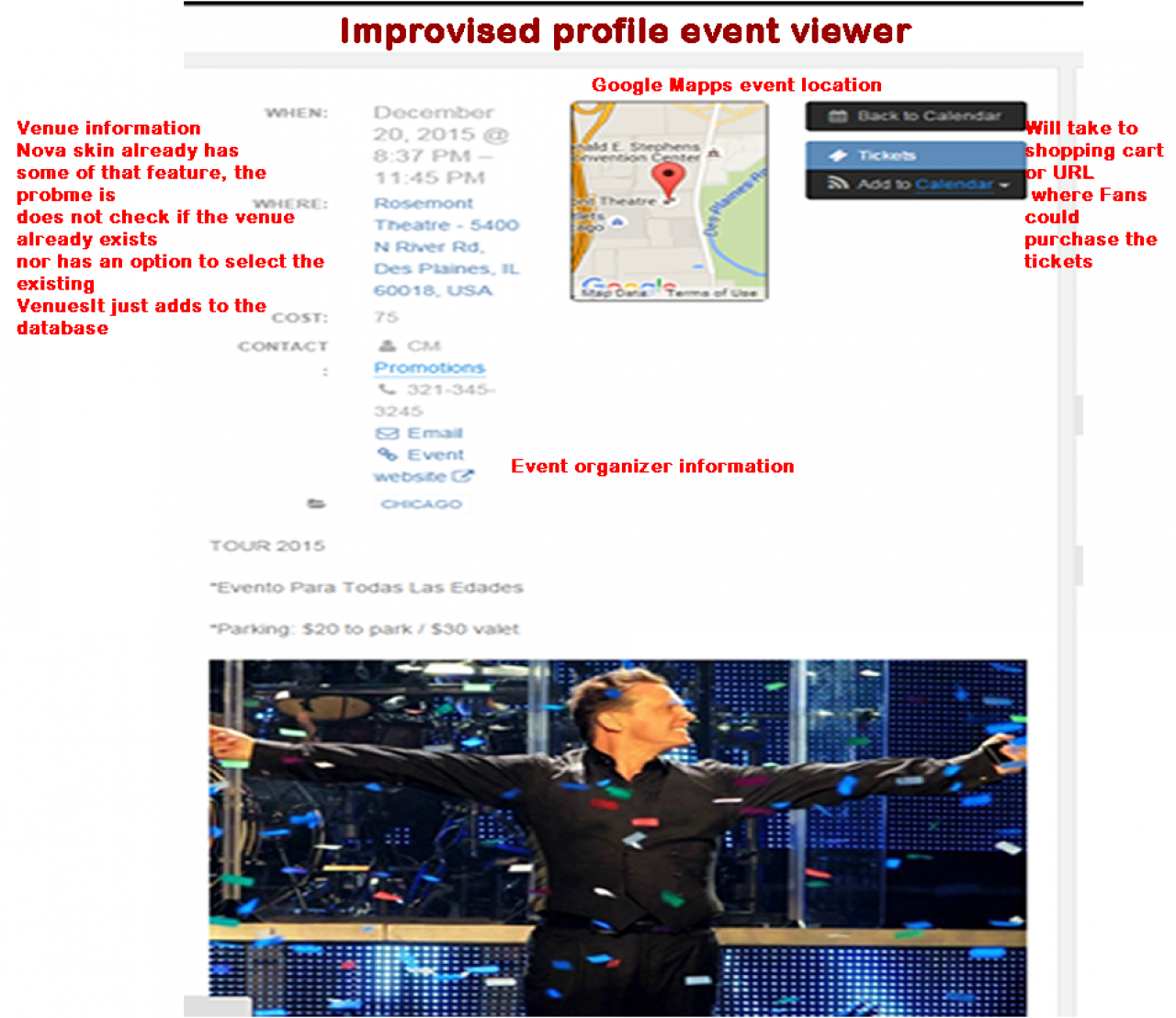 @Luis456 - Have looked at the new images. What you want is doable by using the Form Designer and the UltraJam Google Maps module, as mentioned above. Jamroom modules are designed to be initially simple so as to allow users to use the Form Designer to add the features they want. For example, another user might not want promoter detail fields as you do, so if they were there by default, it would make the module unsuitable for other users. You also say that the event page layout is too simple. Again, this is by design as the template(s) controlling the layout are available for you to modify however you want.