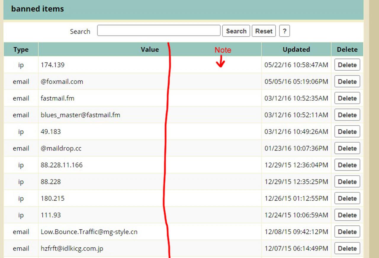 I've accumulated a good number of Banned Items (IP address ranges, email addresses, domains...). Every time I add a new one I think how nice it would be if I could add a brief NOTE to remind me WHY I banned the item...or what it is.