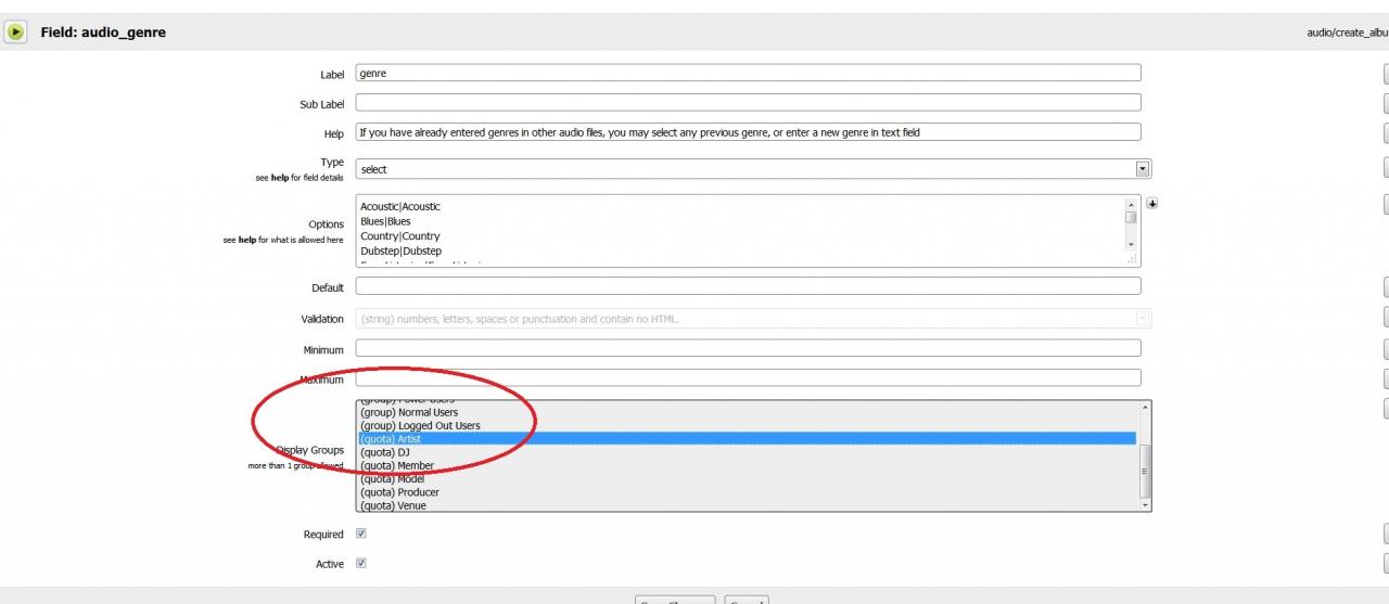 If i set all the genres up for Artist on in the form designer and select it viewable by artist quota, then also set up the producer ones and save them viewable for producer quota it overwrites the artist ones also.
