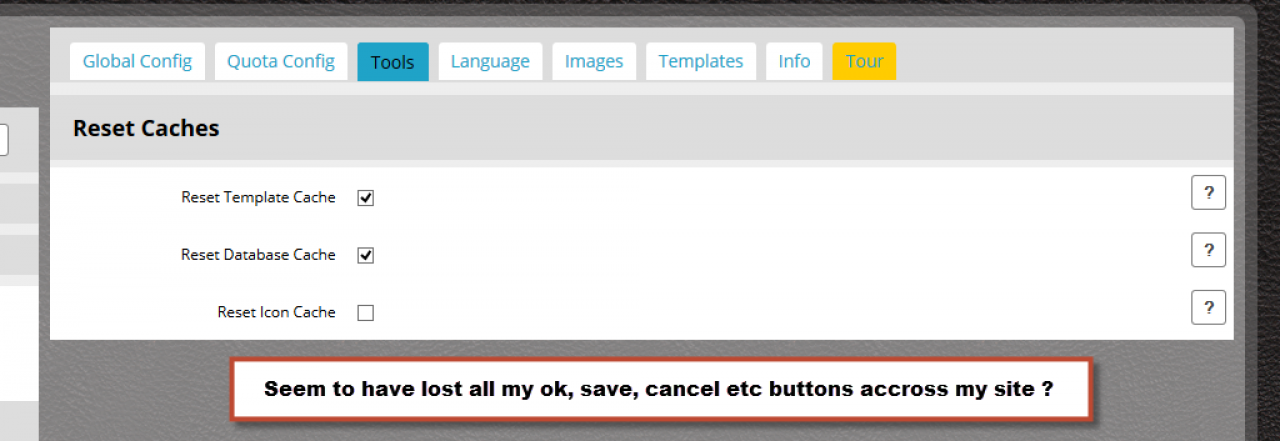 All of a sudden I seem to have lost all my updating buttons accross my site. Checked all my css changes I made and all looks ok. Everything was working fine then went to update a blog and no save buttons etc at the bottom. Checked all over the site and it's the same for everything. Can't change out skins or integrity check either as the ok buttons are missing in the acp to. I added an image for you to see those missing buttons. Not sure what else I can do so would be grateful if anyone could take a look into the issue for me, cheers.