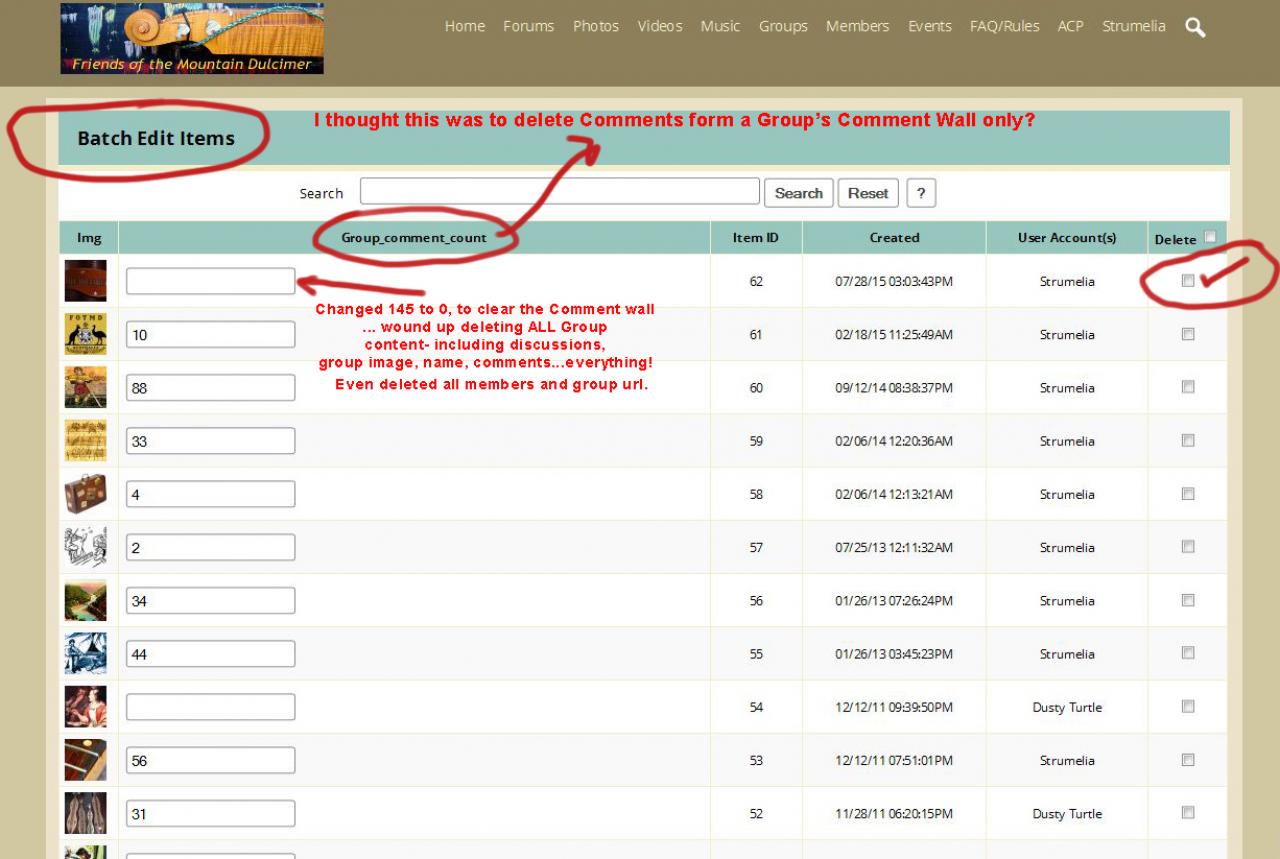 Well, to see if you can replicate- like i said in my screenshot above- I had the Baritone Dulcimer Group there showing on the left column of Group avatars, it had its comment count in it's comment count box there. I changed that number to ZERO, then I 'checkmarked' the Delete box in the right column. Then I clicked the page bottom's save/update button. There was a nag screen asking if I was 'sure' i wanted to delete, but I assumed it meant the comments. Looking back, I suspect the delete boxes on right are actually for deleting the entire Group?- which is what happened.