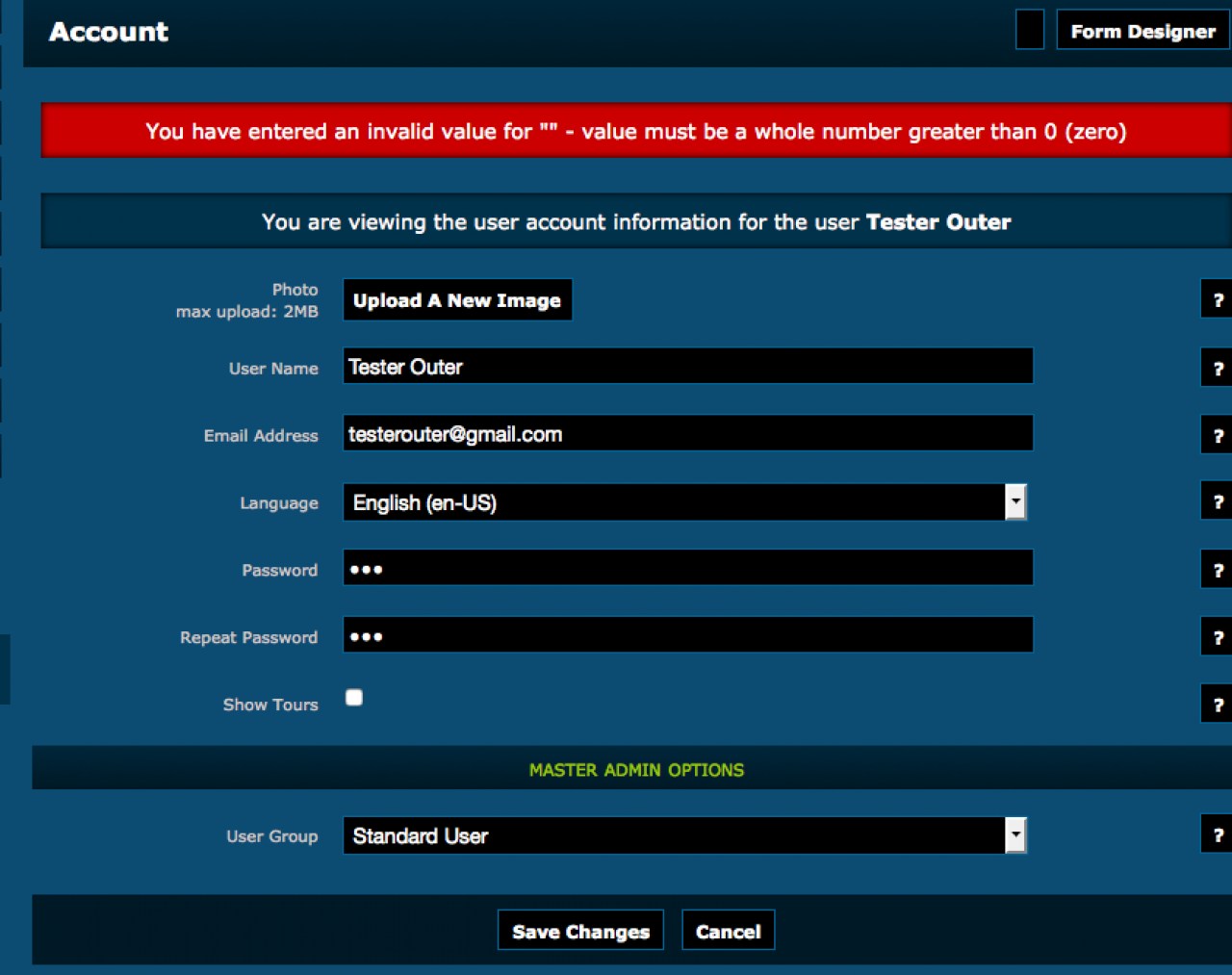 However, I cannot later save changes in the Account Info Page. I get an error, "You have entered an invalid value for "" - value must be a whole number greater than 0 (zero)"
