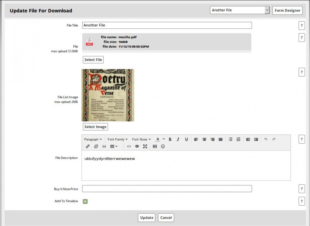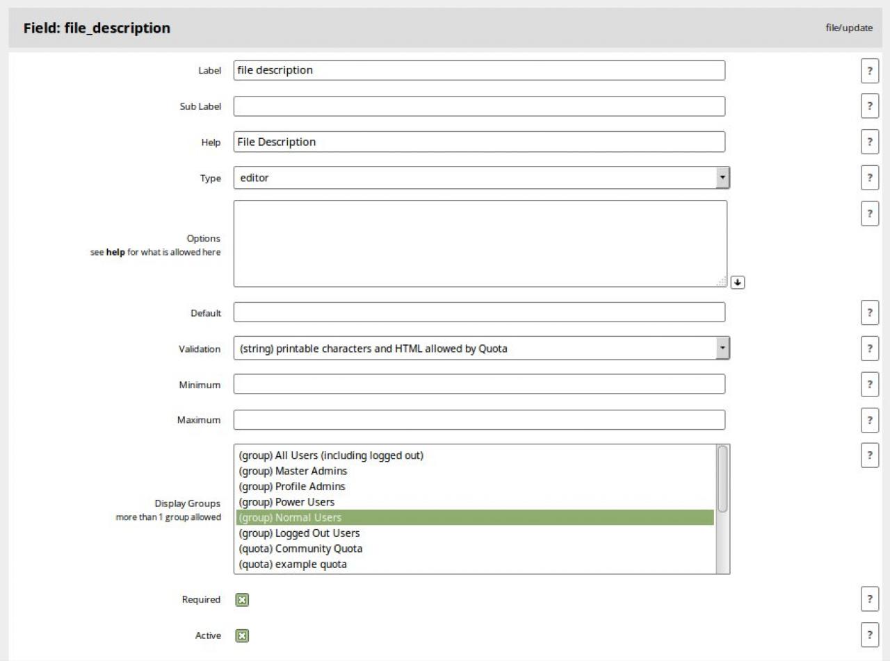 2. Trying to create a File Description field using Form Designer. It does not display on the page. Can anyone tell me what I am doing wrong? ( See attached screenshots )