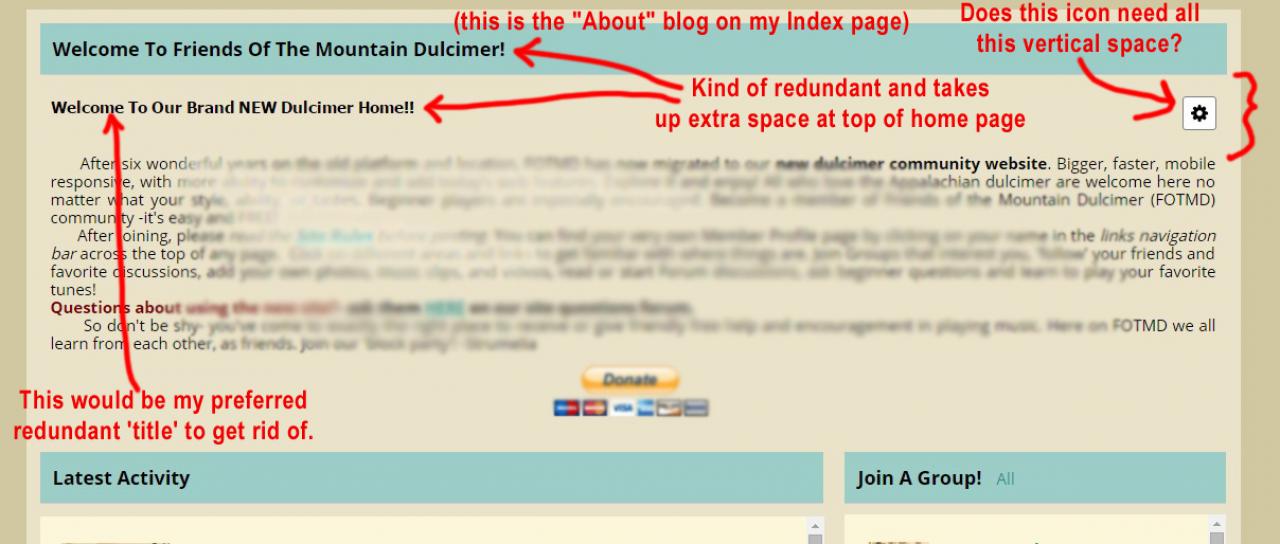 My "About blog post, which is the first welcome info members see on my main/home page, has a title AND a sub title with lots of empty space around it. It hogs the screen for new visitors. I'd love to shorten it up a bit so they can see additional interesting stuff in their first screen impression...please see the screenshot.
