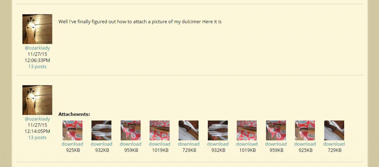 See screenshot- this member just 'figured out' how to attach a picture within a post....and promptly attached TEN pix totally almost 10 MB in one post. I can foresee other members following her lead now.