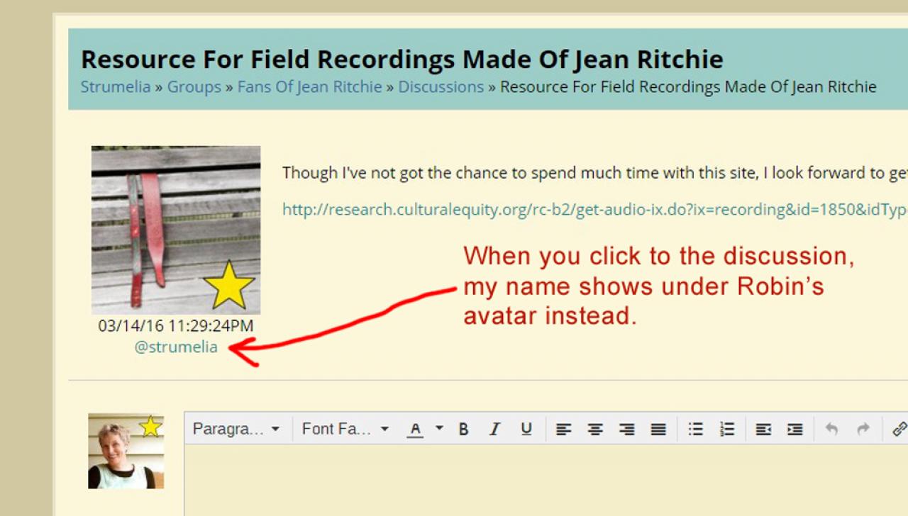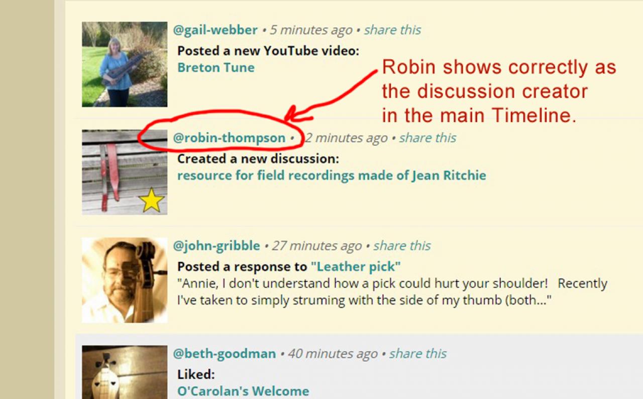 However, in clicking on the link in the timeline and going to the disucussion, it then shows her avatar but with my name-link underneath it as the discussion creator.