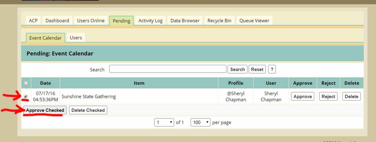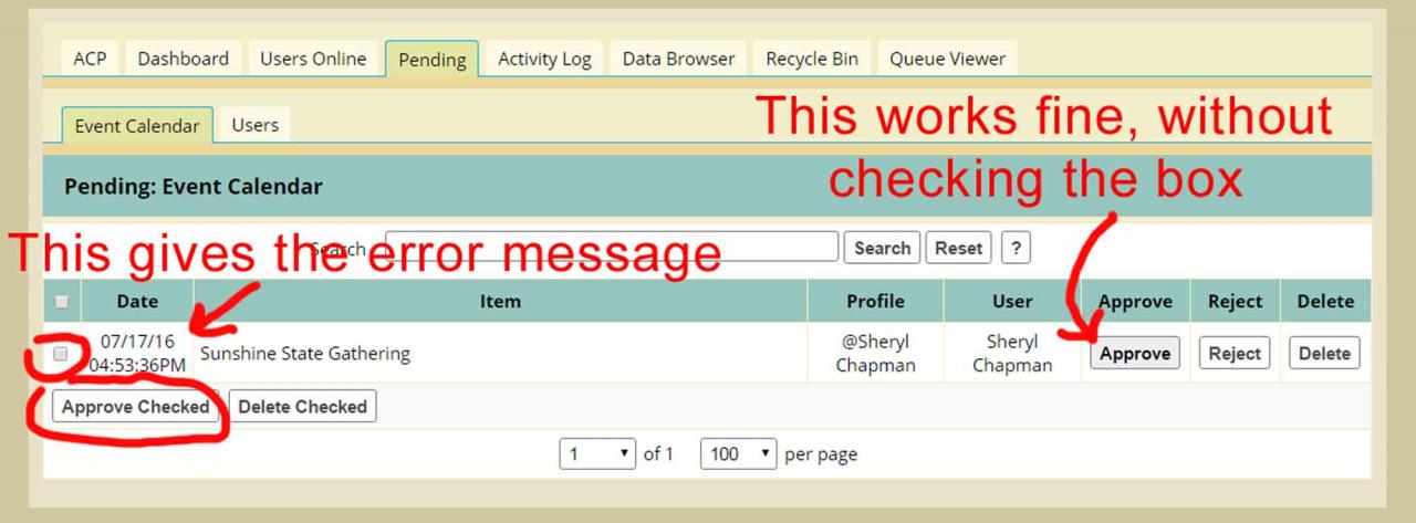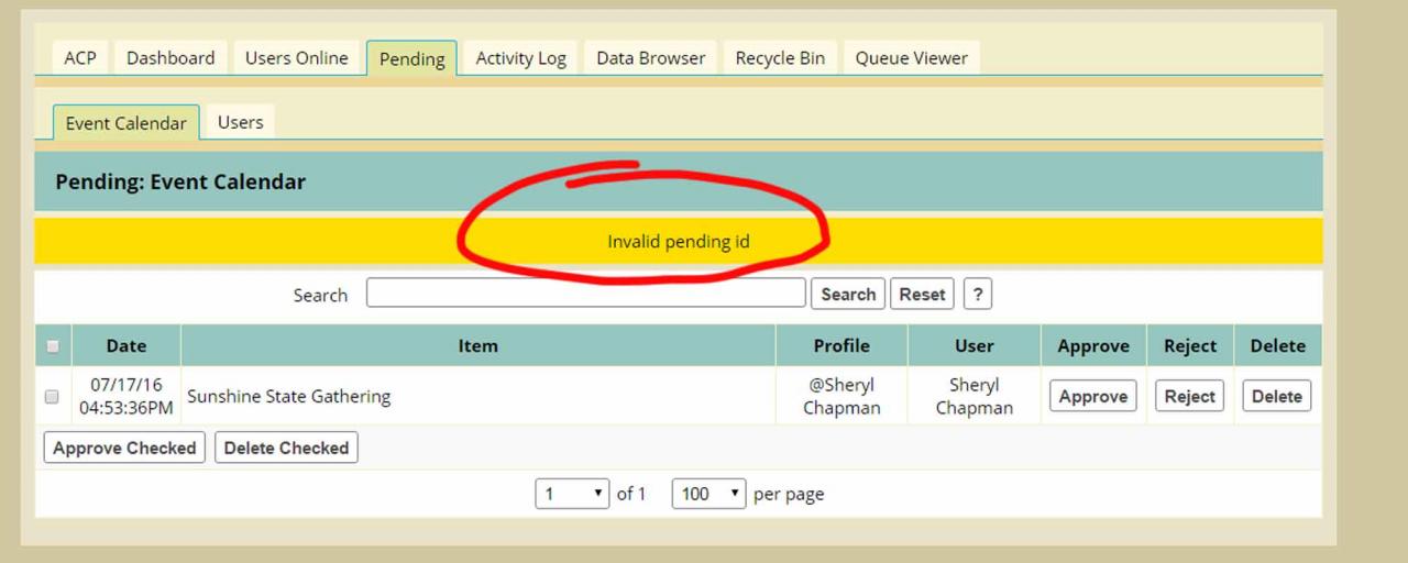 If I use the little checkbox and then the "Approve Checked" button, i get an error message and the event is not approved. But when i simp0ly hit the right hand "Approve" button, it works correctly and approves the pending event.