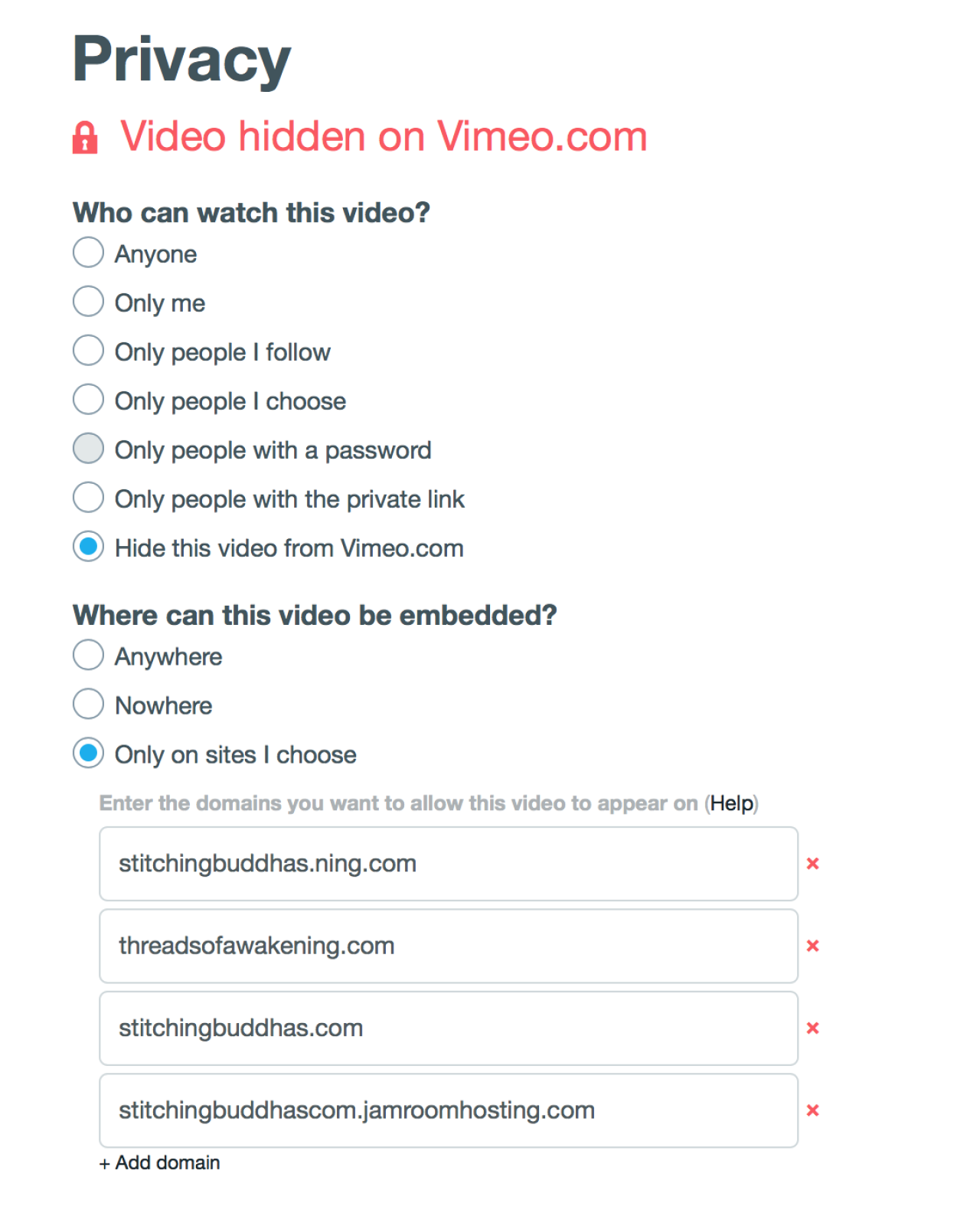 I have several private videos on Vimeo, set to only be available on specified websites. I updated my settings there to include my Jamroom site. The videos play on the site but they are listed by title only, with no thumbnail image. Seems like the privacy is blocking the picture from showing up, even though the video is allowed. Makes for an ugly display, and makes people less likely to watch these videos. Is there a way to pull these images? (They showed on Ning, where the videos were added with embed code from Vimeo.)