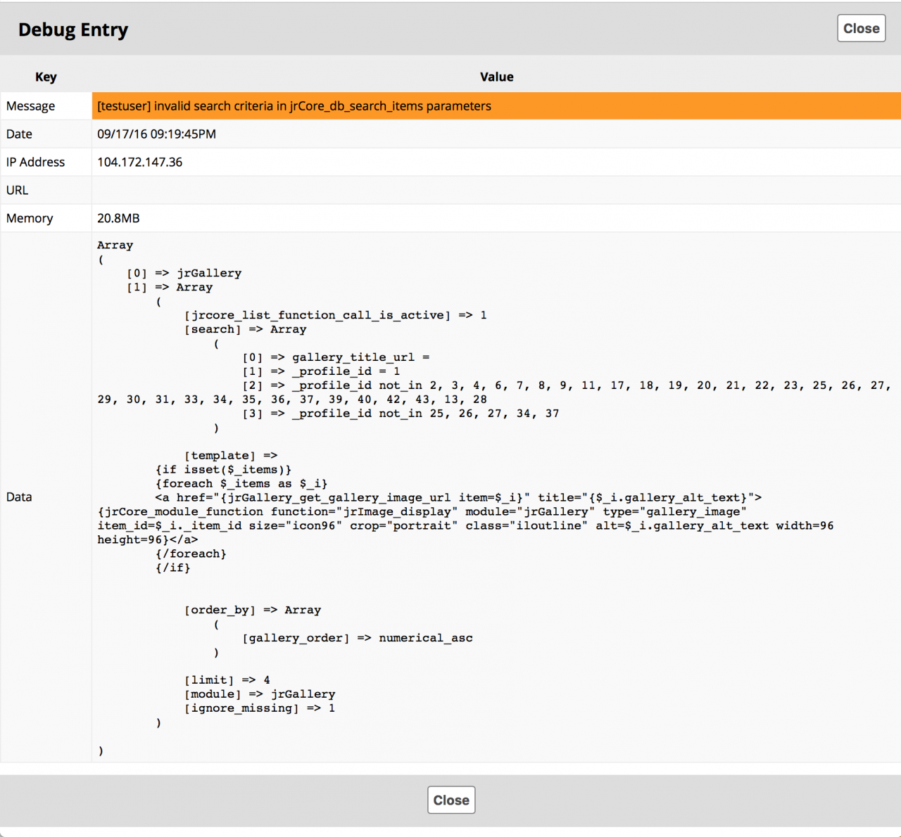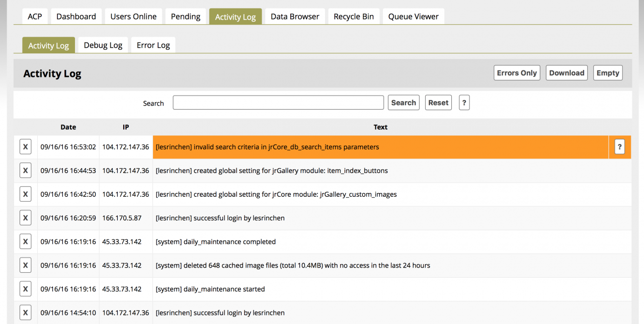 The subject line of all the errors is "invalid search criteria in jrCore_db_search_items parameters", sometimes with a user's name in front of it, sometimes without.