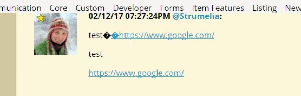 Ones types normally, then types a space and then pastes an URL in. The result is a hotlink that you can click but it takes you back to simply the refreshed page. It also inserts these two weird diamond shapes with question marks in them instead of the space. (SEE SCREENSHOT) This is what the post's code would look like (as an example):