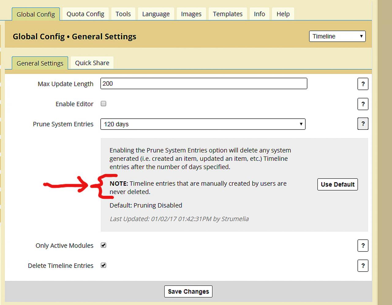 Question: Does this Help statement mean those timeline entries and their files are going stay on my server and take up space for all eternity? I have the Timeline module's "prune system entries" set for 120 days... but are these profile entries created by users immune to that pruning and remain forever? =8-(