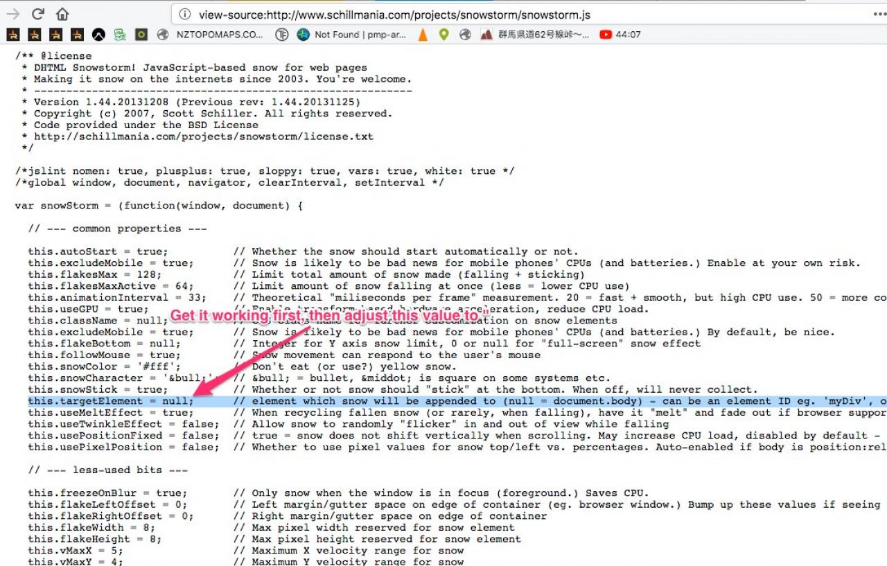 However, I then ran into problems customizing the snow effects as per the instructions in the snow script itself. I understood their instructions. But could not turn off the damned mousefollow effect ("null" and "False" both did nothing), and the speed of the snow was also wildly fluctuating....was totally different every time I refreshed my browser page. Changing the numbers and values in the script the way they instructed didn't seem to do what it should. Couldn't get rid of the fact that moving my mouse to one side of my home page would create a 200mph blizard. Annoying as heck!! =8-0