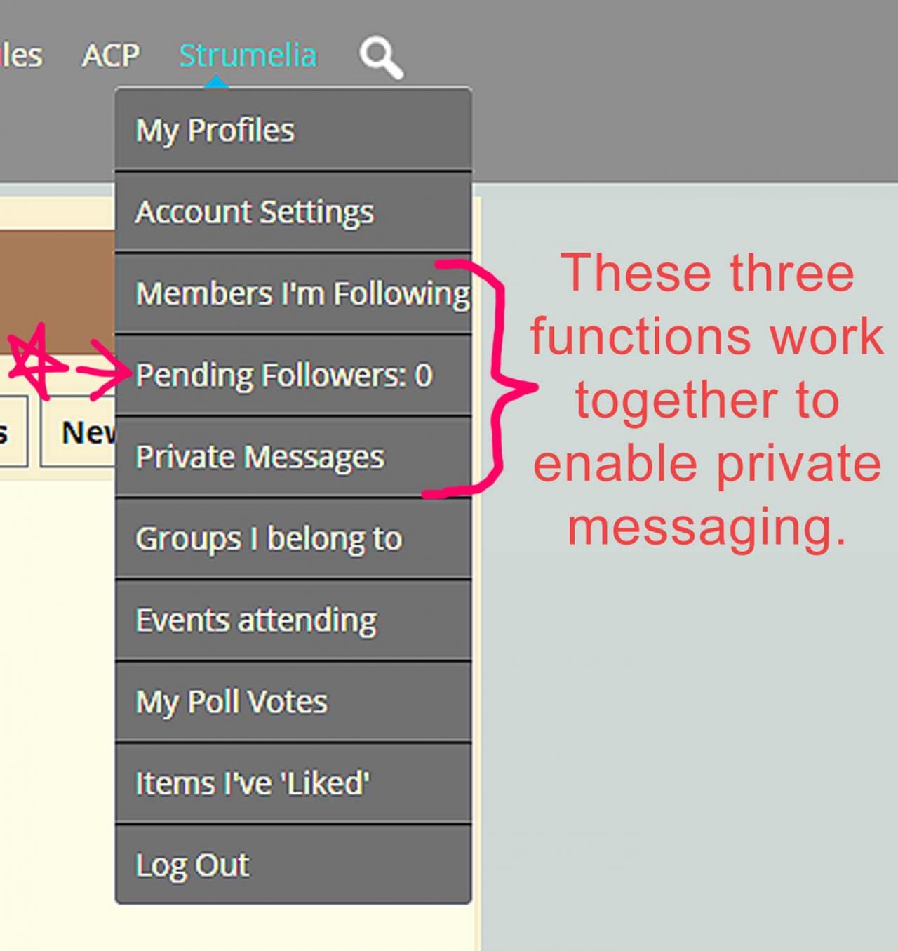 As in earlier in this thread, thanks to support here I've also added a user dropdown menu link to "Pending Followers" with a number, which will go a long ways to help members REALIZE they have some pending. (most members were not thinking to click the Followers TAB on their profile page... tending instead to just look at the avatar pics of their recent followers on their profile page widget...which does not show any 'pending' status. This is similar to the user menu link to Private Messages with a number following it showing one's unread messages.