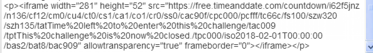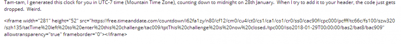 Very similar code worked fine on the discussion https://pmp-art.com/library/group_discuss/692/pmp-monthly-challenge-dec-jan2018. The only difference was the timezone on which the clock was based and the end date.