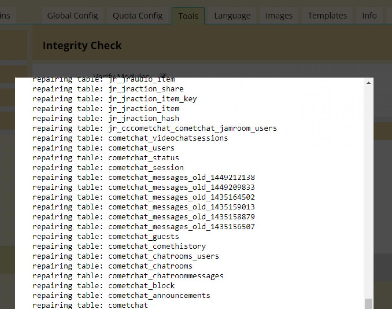 A couple days ago I connected via FTP to my server and ran a search for anything with either comet or cometchat in the file name. I found a bunch of stuff in my data/media/1/0 folder.... stuff like "201802250910:cometchat_chatroommessages:99CaEwC9C6GG.sql.gz" and I deleted dozens of such files with "cometchat" somewhere in the file name. Now they appear to be back again, and I just now deleted the same 133 duplicated/backup files AGAIN. I don't know how they reappeared, but they are sets of duplicates that look to have been backed up. I continue seeing lots of "optimizing table" and "repairing table" cometchat files when doing integrity checks.