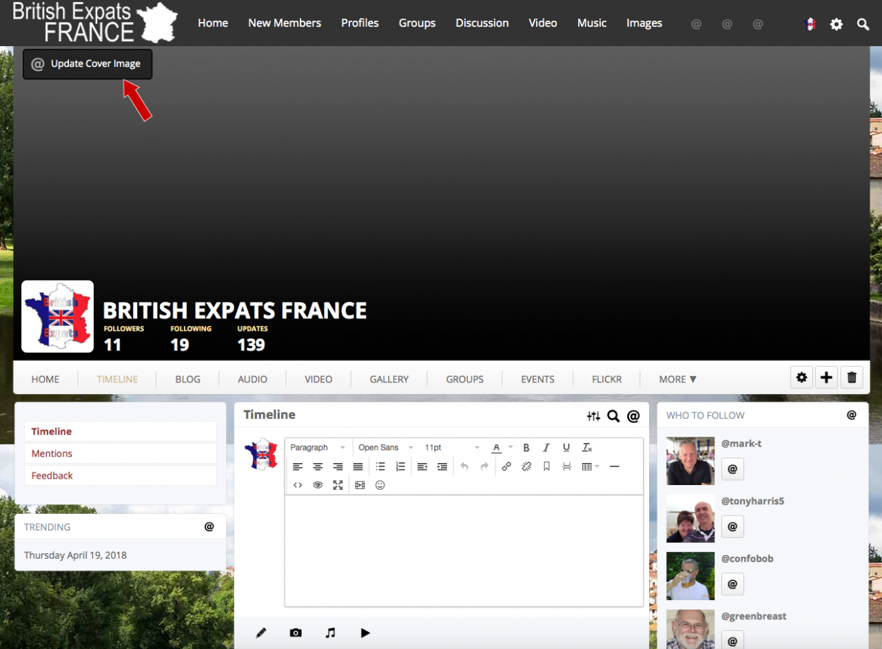 When the "Update Cover Image" link is clicked, it simply takes the user back to their profile page and there appears to be no option available to update the cover image (the customisation tab doesn't have the option either).