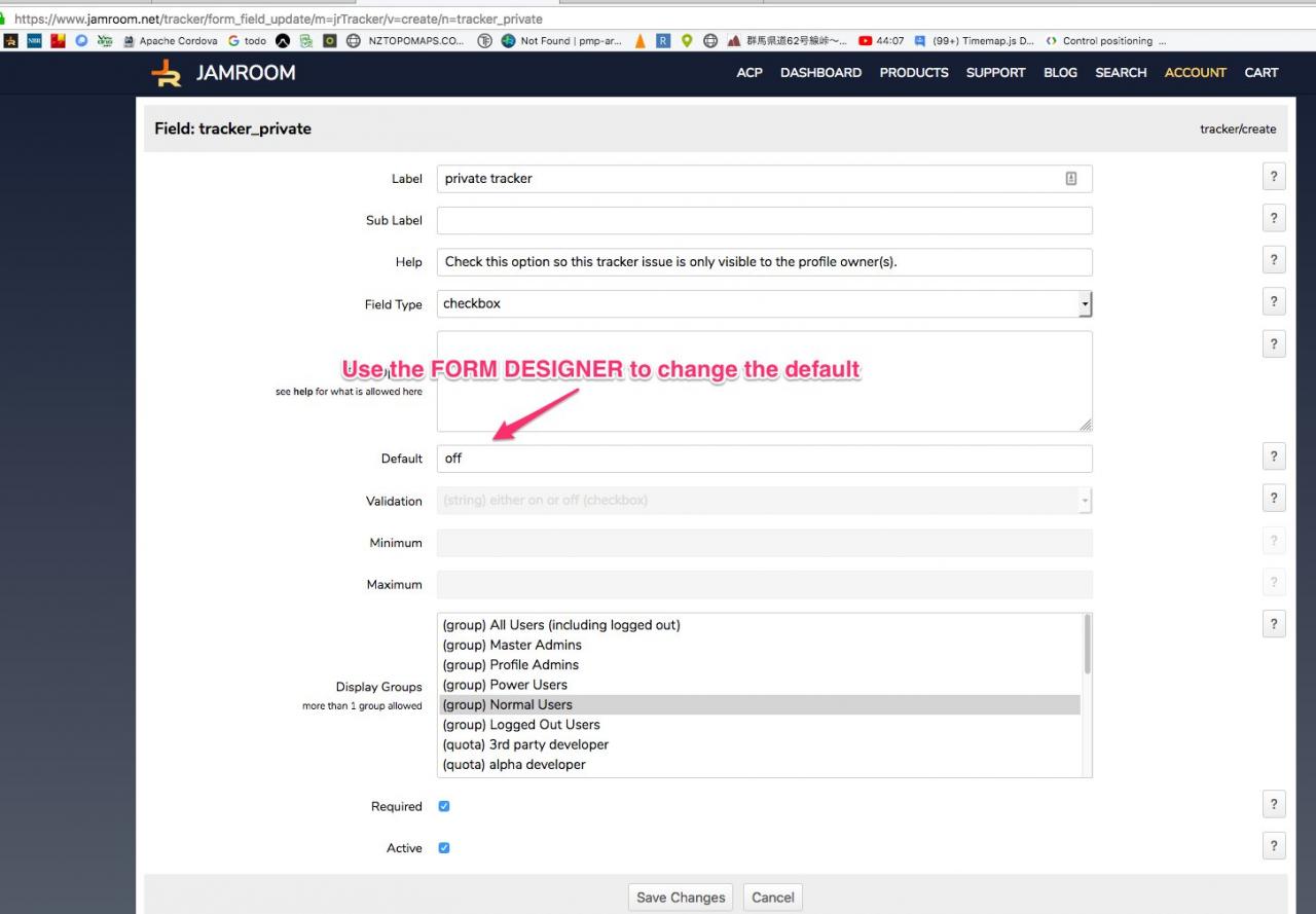 2. Use the Form Designer to change the default of 'off' to 'on' for the private tracker button in the CREATE screen. (screenshot)
