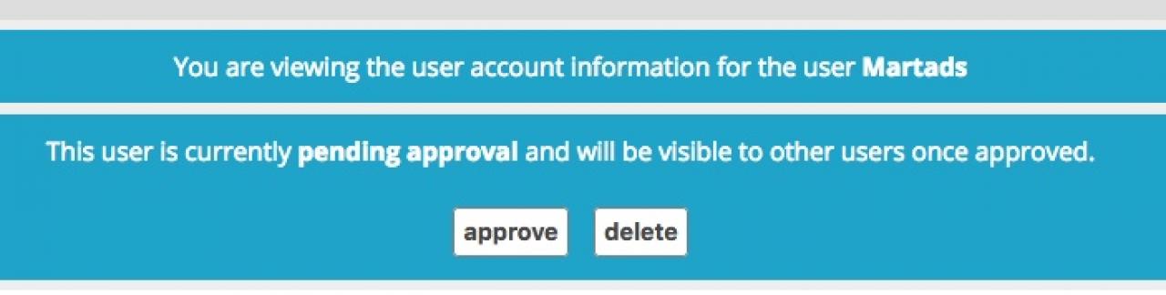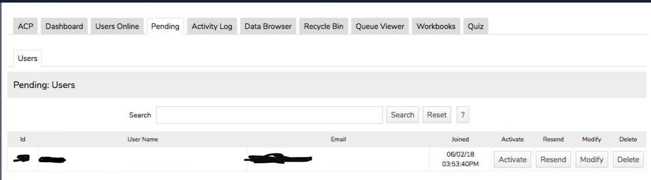 If they do not click on the activation link, their account appears in the ACP User Account Browser as "Pending". At this point, I (Admin) can choose "Modify", "Approve" or "Delete".