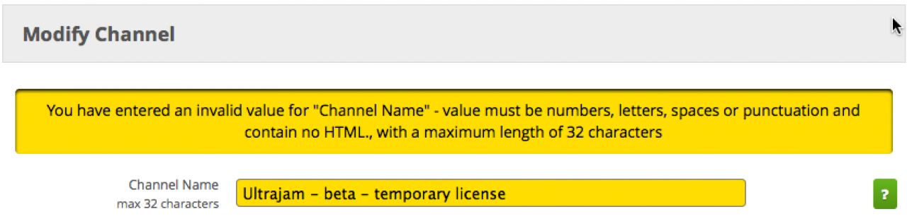 When modifying a channel name in the marketplace licenses (here on jamroom.net) I get a validation error, although only letters have been changed. So I can create it as "ultrajam - ultrajam - temporary license" but I can't update it to "Ultrajam - beta - temporary license"