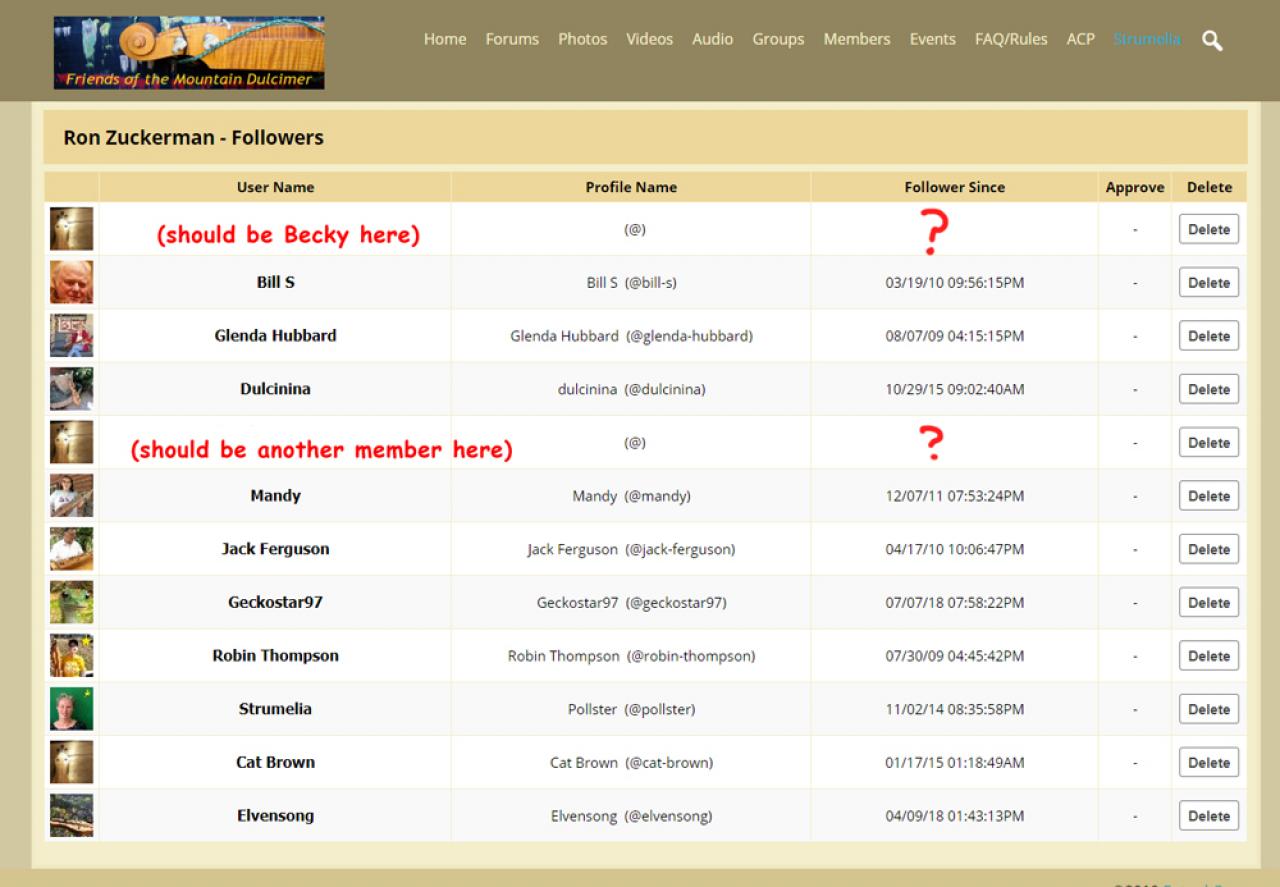 If you go to that last link in his notification email, you'll see this (see attached jpg). When I went there from his email link, the top follower was nameless but PENDING. I knew it was Becky, and clicked to Approve her, but it did not work. Then I tried to Delete the entry from there as well, and that did not work either.