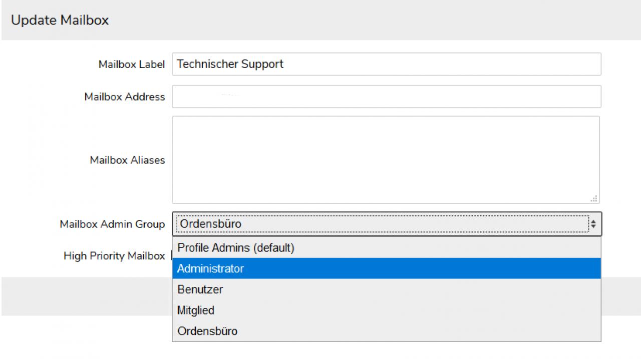 When I select "Administrator", the first element in the list, as the mailbox admin and save, it'll show "mailbox admin - quota_id: 1" in the overview and send mails to "Mitglieder", which is the group with quota_id: 1.