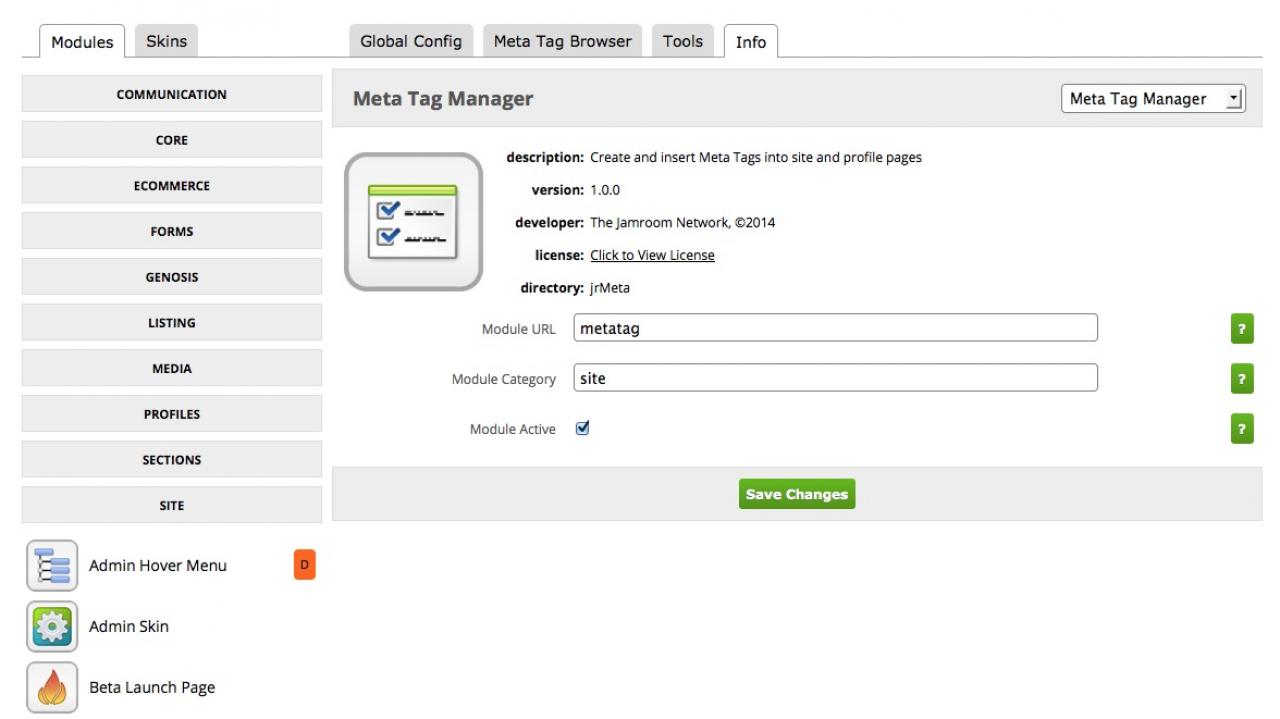The Meta Tag Manager makes it easy to add, remove and update Meta Tags throughout your Jamroom site. Includes the ability to specify custom Meta Tags for multiple areas of your Jamroom site: