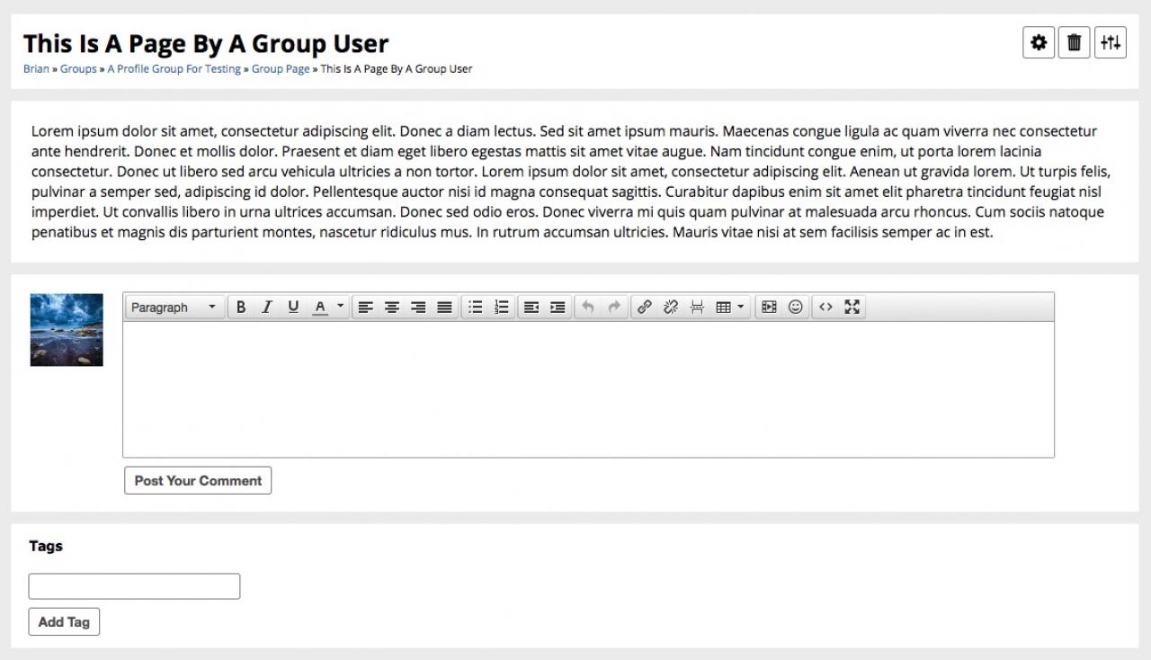 The Group Pages module is a Profile Groups module (requires the Profile Groups module) that enables pages (with comments) in a profile group.