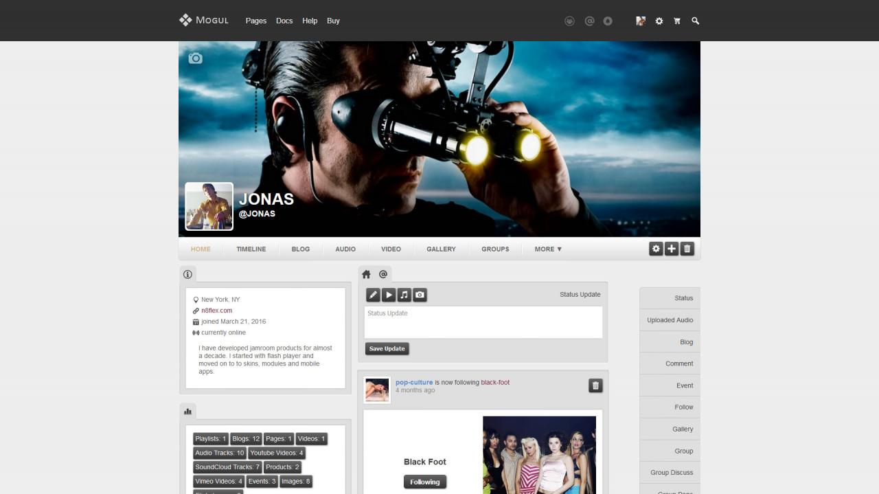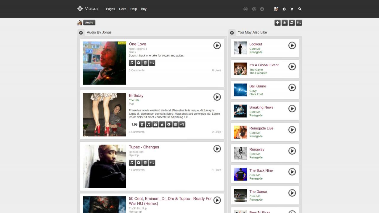 Mogul is a new and stylish skin template for jamroom. With over 200 custom templates, it features CSS3 Animations and a very cool look. As with all our skins, the index page is completely configurable with just a few clicks. Mogul is Site Builder ready and ready to take your site to new heights.