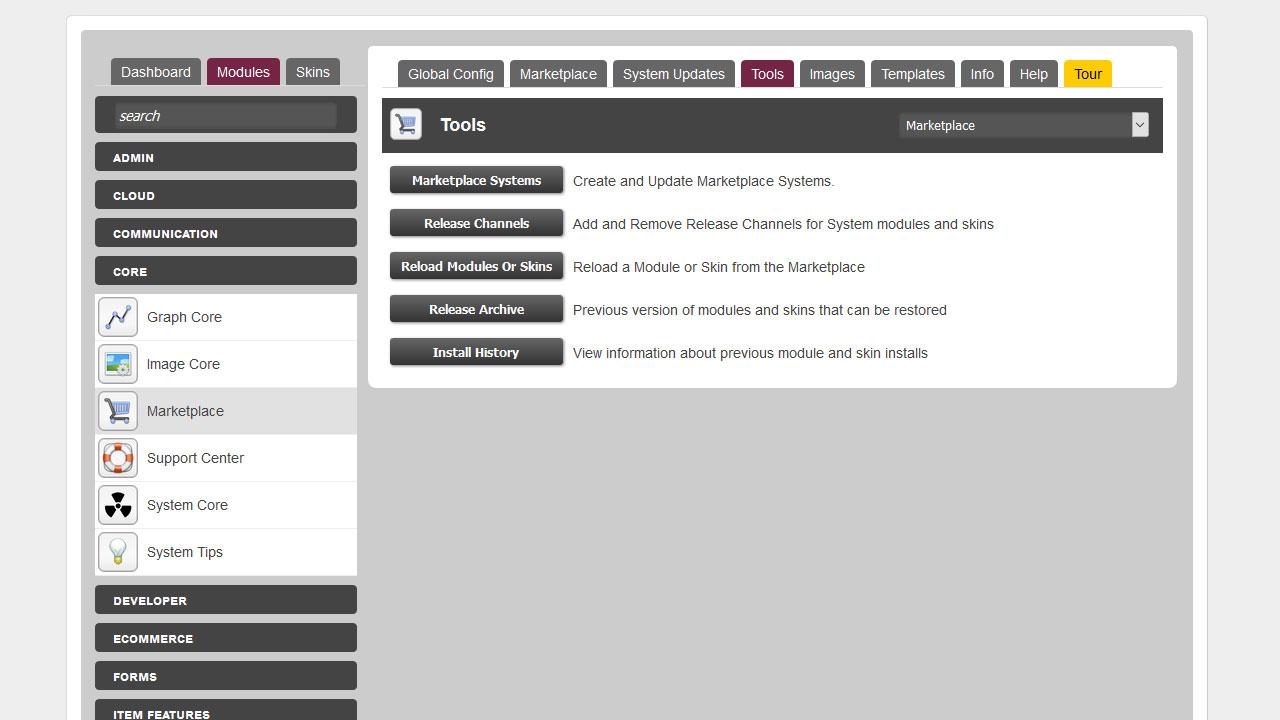 This is the Marketplace module for Jamroom. Quickly install and update modules and skins through an easy to use interface.