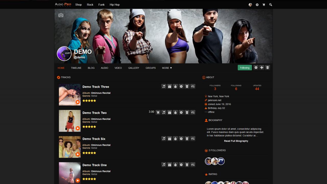 Audio Pro is the premier Audio skin for Jamroom. Featuring a clean, modern and responsive design, Audio Pro has been built from the ground up to showcase and highlight musicians of all kinds. If you're running an audio centered social network, check out Audio Pro.