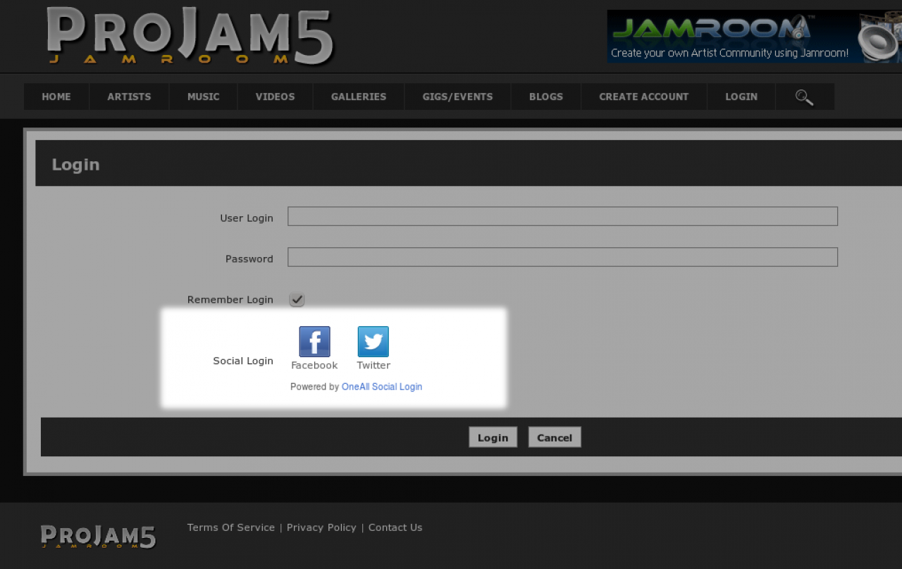 Let users and visitors login and signup to your Jamroom using the OneAll Social login system which features over 20 social networks including Facebook, Twitter, Google, LinkedIn and more.