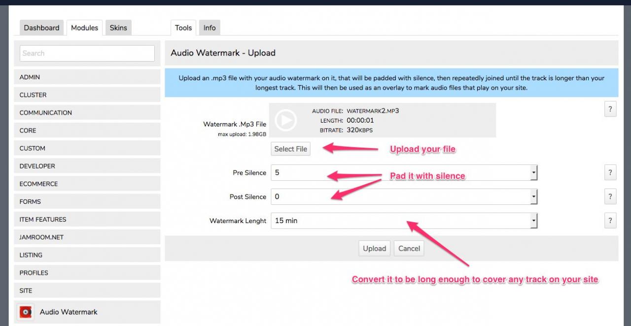 Allows the site admin to upload a short .mp3 file that will be used to tag tracks that are uploaded to the site.