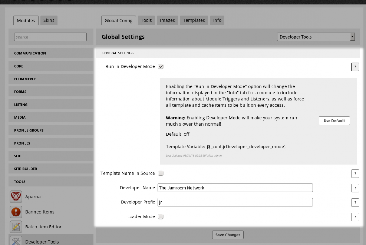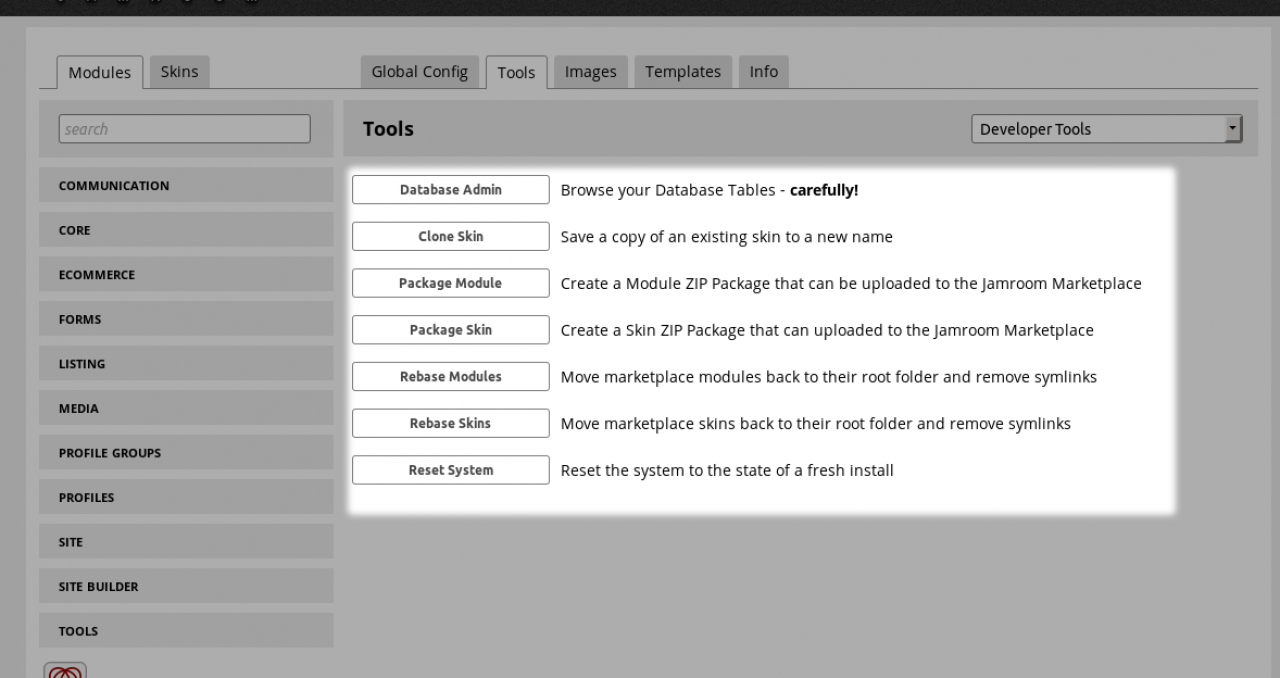 The Jamroom Developer Tools module is designed to help developers when creating new modules and skins for Jamroom:
