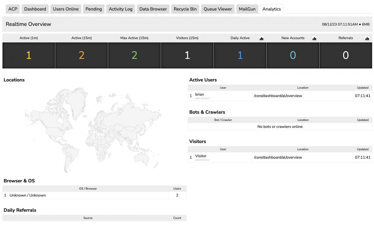 The Analytics module adds a new "Analytics" tab to your JR dashboard with a real time overview of your current users including logged in users, visitors, bots and referrals.
