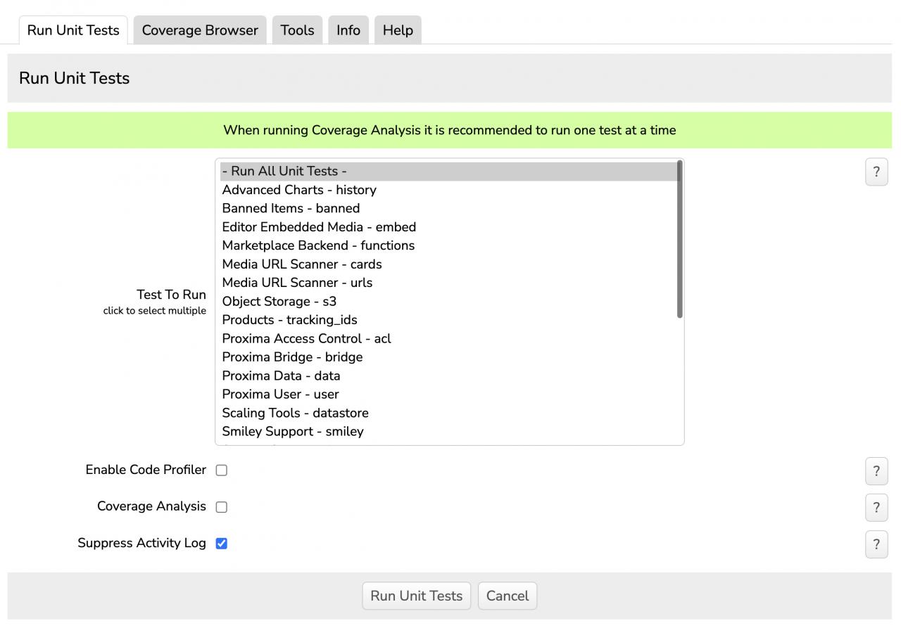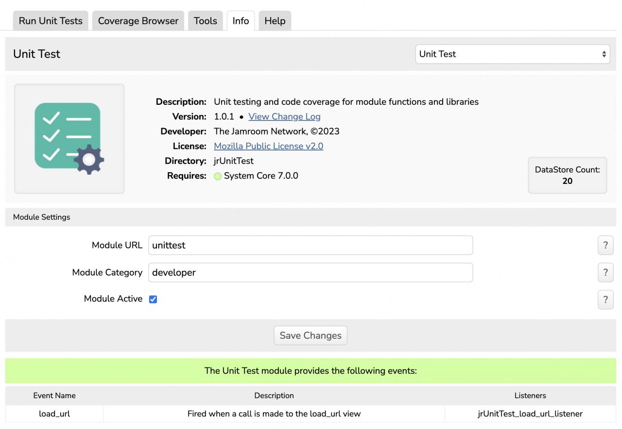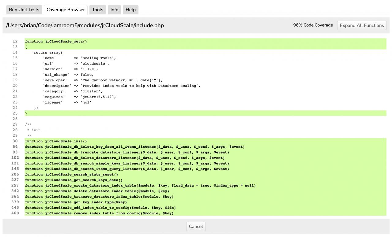 The Unit Test module provides a unit testing framework for Jamroom module developers. Along with unit testing it also provides a Code Coverage results browser as well as the ability to generate callgrind code profiling results for use in code profile viewers like MCG, Valgrind, KCacheGrind, etc. Requires the XDebug module is installed and configured in PHP.