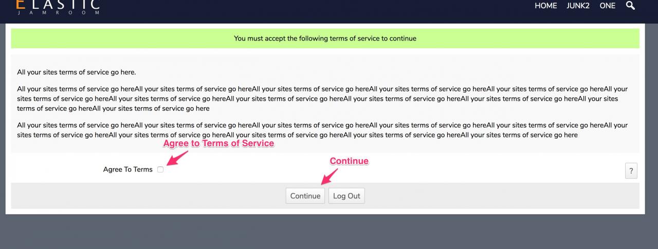 The Quota Terms of Service module allows you to require acceptance of your sites Terms of Service when a user logs in. You can control which Quotas are required to accept the Terms of Service, and you can have as many different Terms of Service as you would like. The actual page that contains the Terms of Service is created in the Page Creator module, so that is required for this module to work.