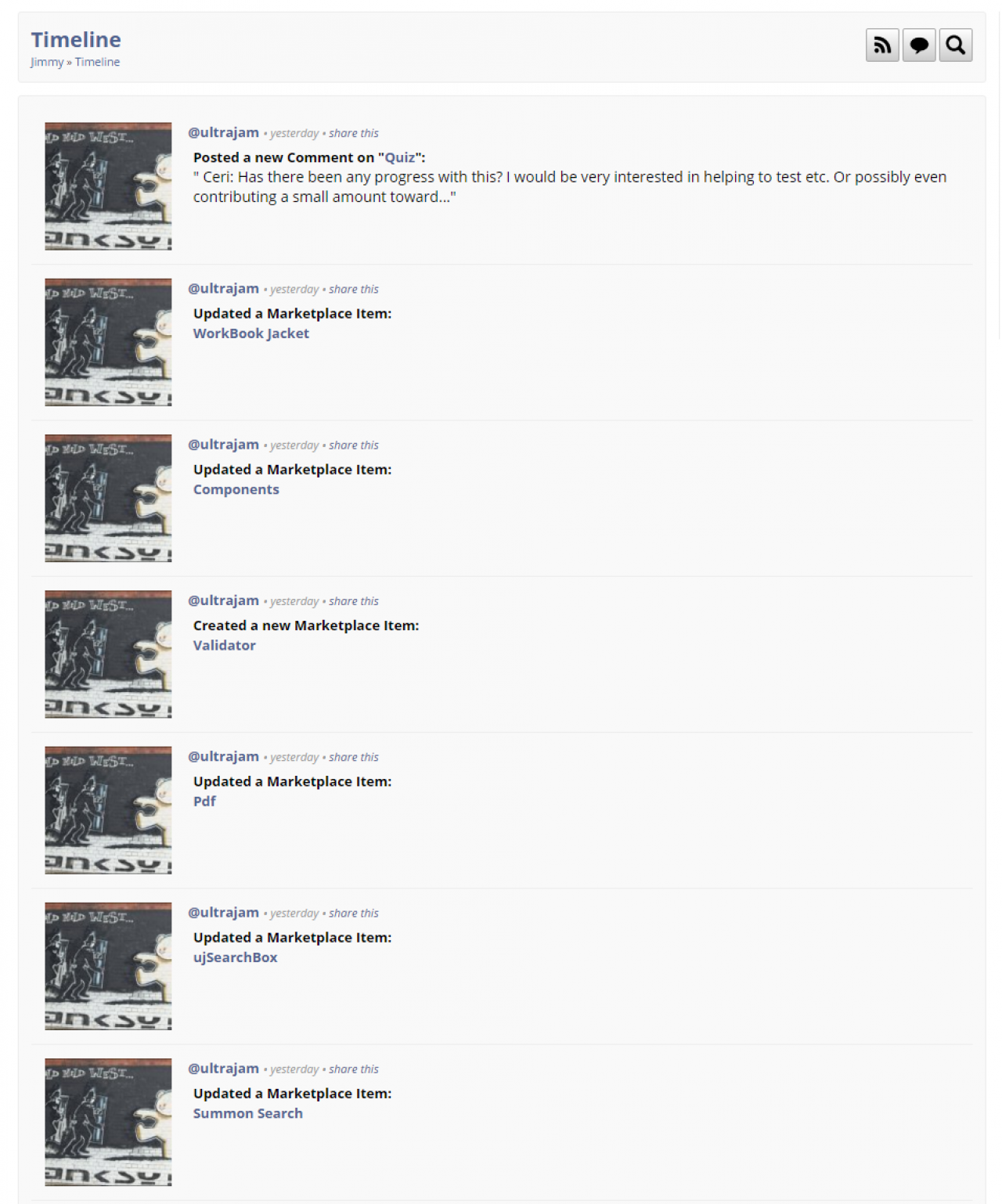 In the image below, if I click on the "Quiz" in this line: "Posted a new Comment on "Quiz"" it directs to my page https://www.jamroom.net/jimmy